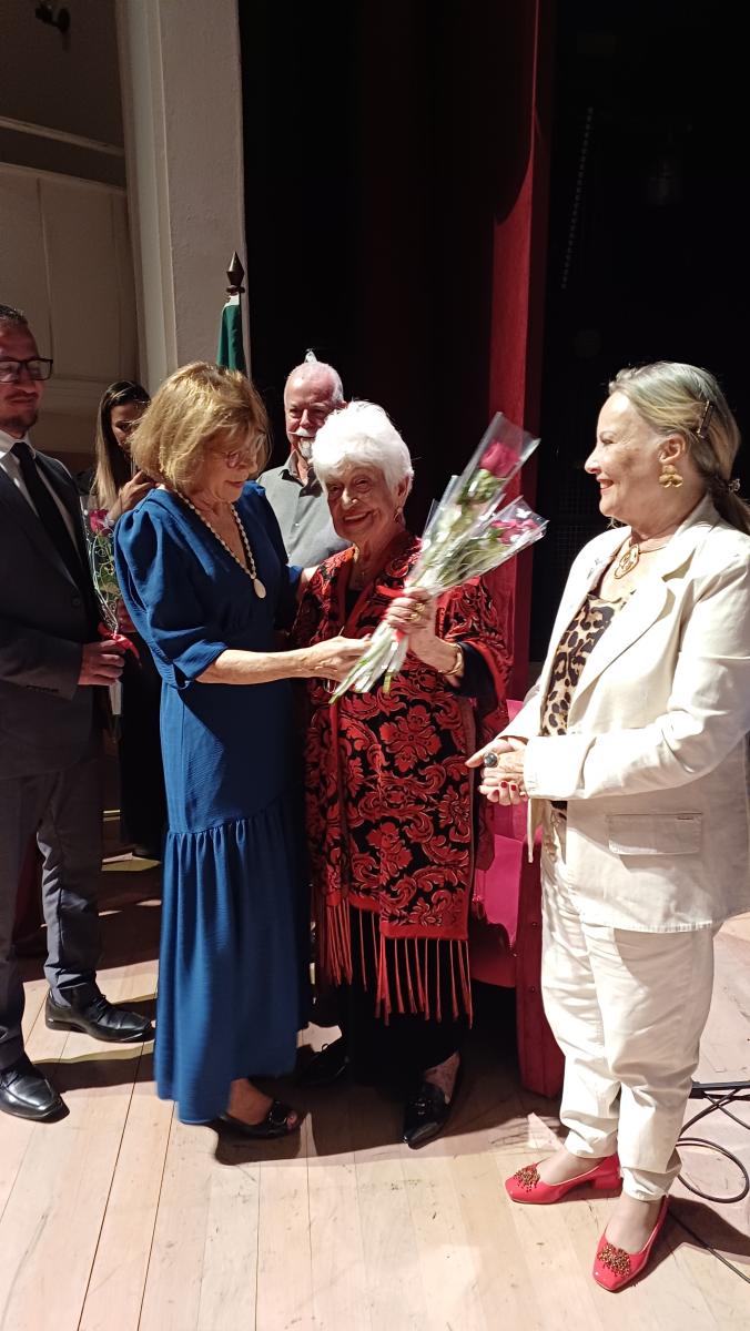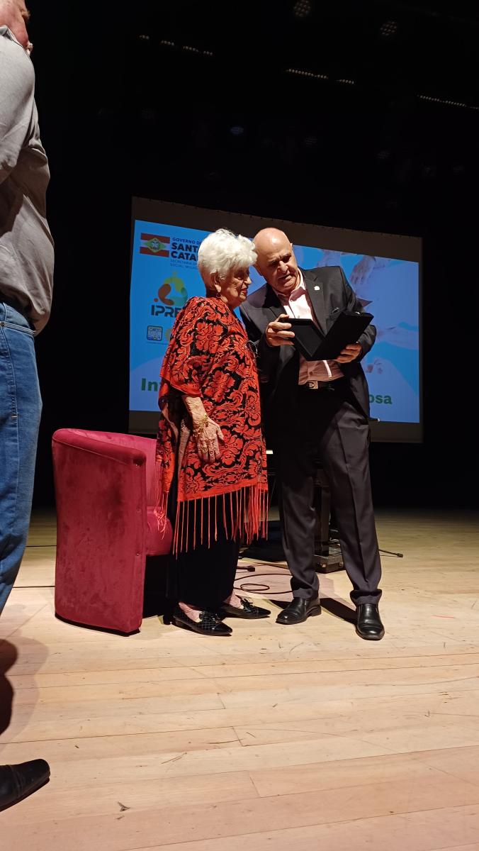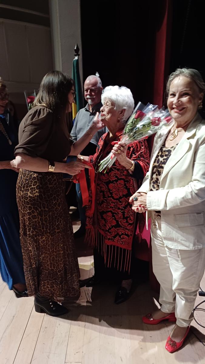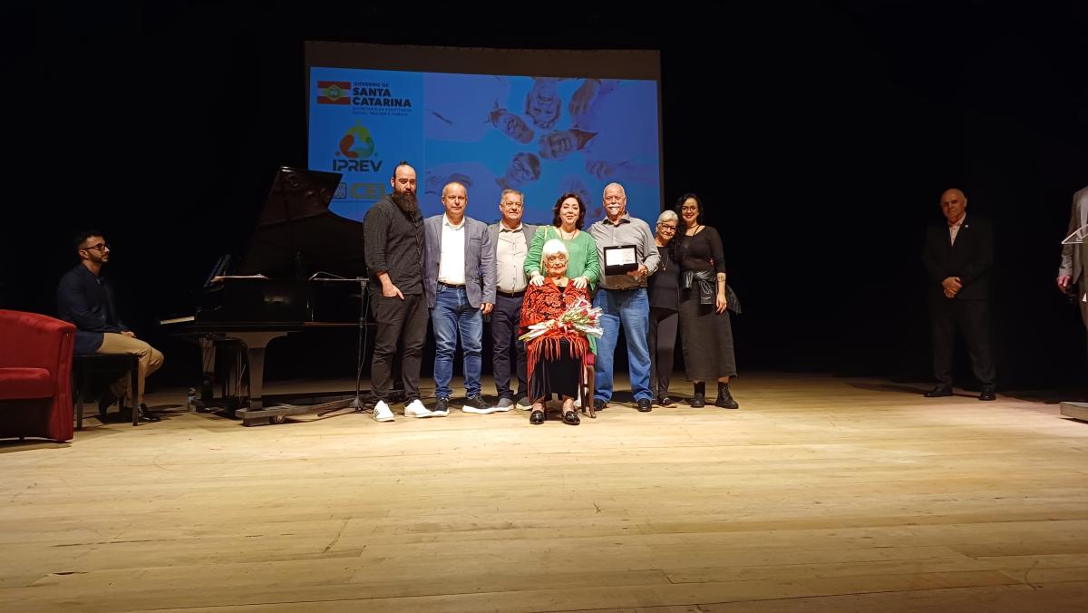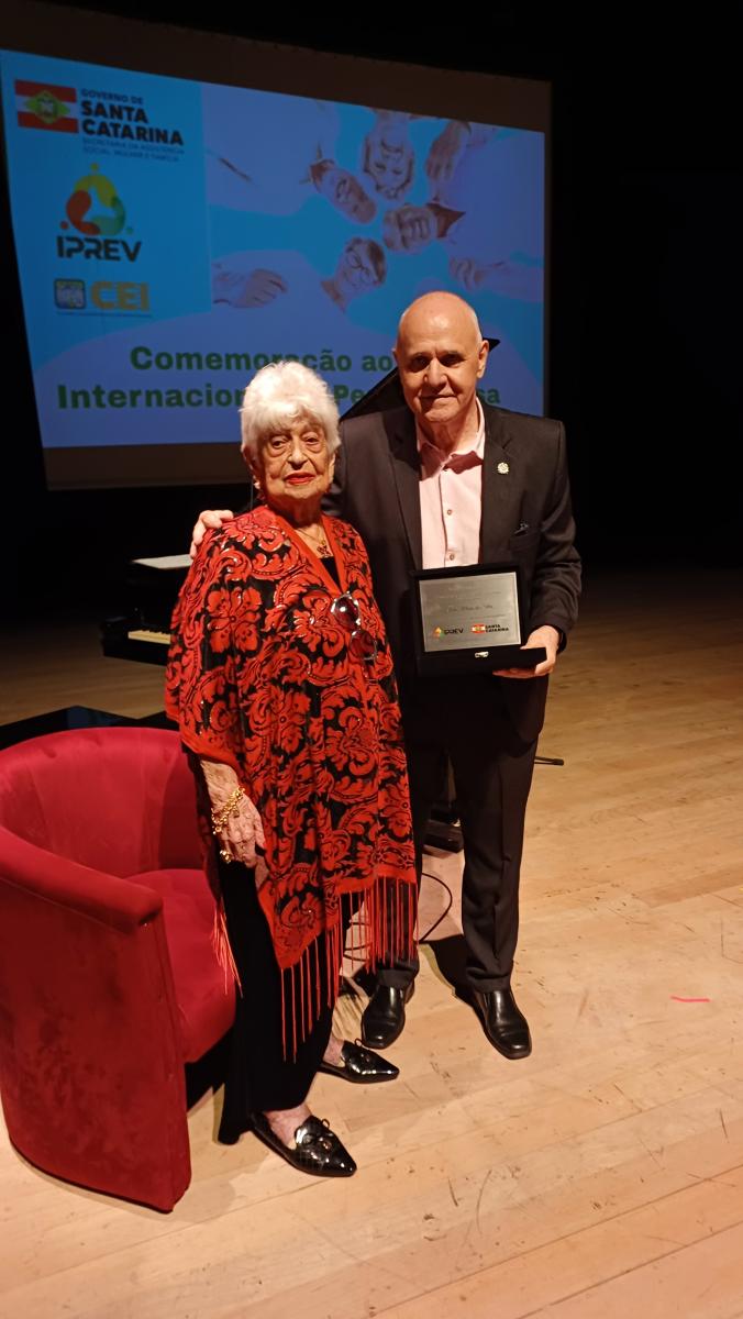 Um dos pontos do evento foi a homenagem à Sra. Rita Maria da Silva, presidente da Associação de Pensionistas do IPREV (APIPREV). Aos 90 anos de idade, Rita segue à frente da Associação há 23 anos, conduzindo um espaço acolhedor que promove a socialização e o bem-estar das pensionistas, por meio de atividades como cafés, viagens, aulas de dança e eventos culturais. Sua trajetória é um verdadeiro exemplo de vitalidade, dedicação e amor à comunidade.